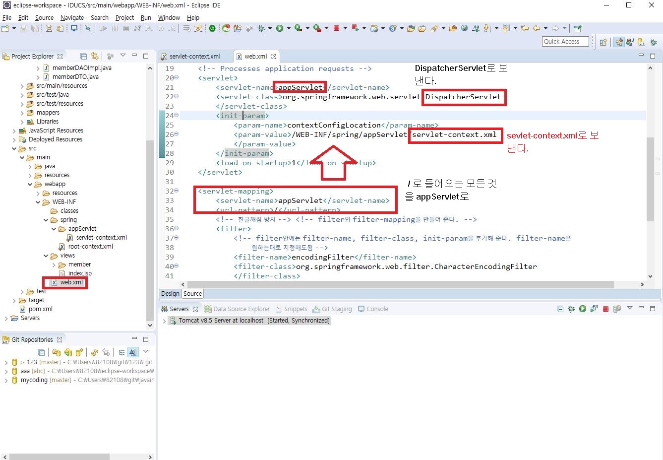 / 로 들어오는 모든 것을 appServlet인 DispatcherServlet로 보내고 servlet-context.xml로 보낸다. 여기에는 컨트롤러가 있다.