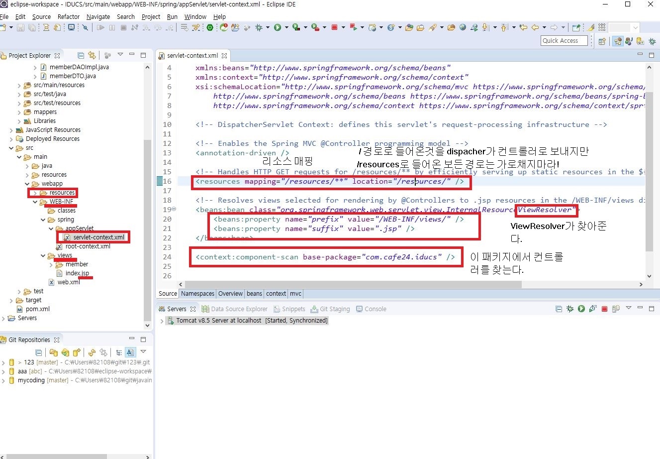 아래 context 에 패키지를 기준으로 찾게 되고, ViewResolver를 통해 prefix , suffix 정해지고 만약 컨트롤러에서 home을 리턴을 시켰으면 WEB-INF/views/home.jsp가 되는것이다.