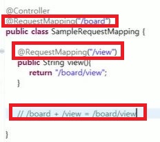 리퀘스트 맵핑은 클래스에서도 사용할 수 있다. 이런 식으로 클래스에도 맵핑을 붙이게 되면 클래스에 맵핑된 주소를 먼저 찾게 된다. 그 다음 맵핑을 이어서 찾게 된다.