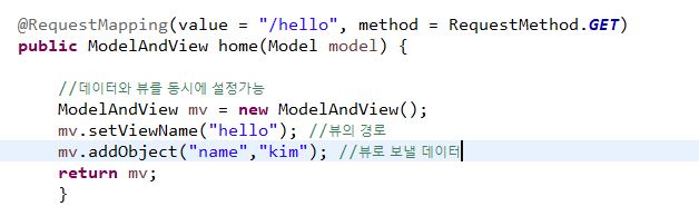 ModelAndView 는 모델과 뷰 를 동시에 가지고 있기 때문에 객체를 생성해주고 setViewName() 으로 뷰의 경로를 잡아주고 addObject() 로 생성해주고 그것을 리턴해 준다.