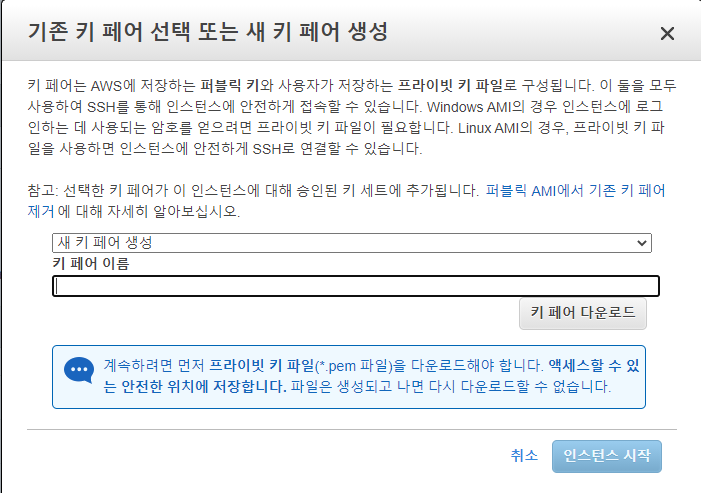 8. 새 키 페어 생성 합니다. 이름을 적고 키 페어 다운로드 합니다.