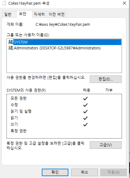 3. [고급] 으로 가서 왼쪽 아래에 보시면 상속 사용으로 되어 있는데 상속 사용하지 않음으로 되었있을 것 입니다.