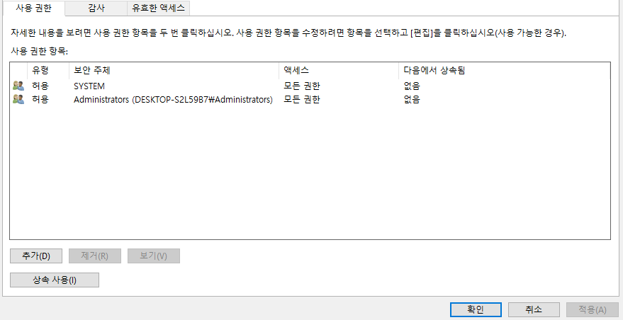 사용하지 않음을 클릭하고 위에 SYSTEM과 Administrators만 남도록 하고 모두 지워줍니다.