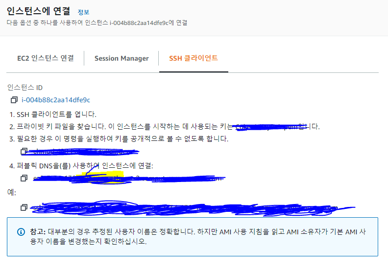 6. 이 때 주의 할 점은 ssh -i "Key이름" 입니다. 키의 이름에 공백이 들어가 있을 수 있으므로 키의 이름과 동일하게 맞춰줍니다.