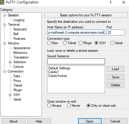 4. 다시 Session으로 가서 인스턴스의 퍼블릭 IPv4 DNS를 복사하여 Host Name에 넣어준 후 Open을 눌러줍니다.
