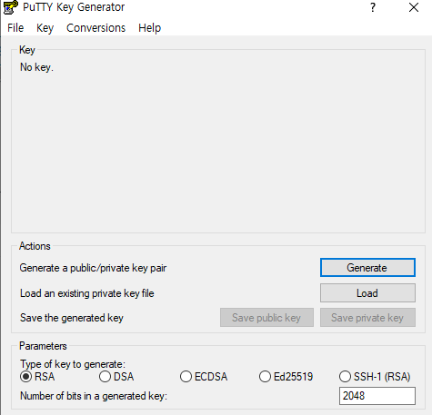 1. PuTTYgen 을 실행 하고 RSA를 선택 한 후 Load로 인스턴스 생성 당시 만든 pem 키를 불러옵니다.