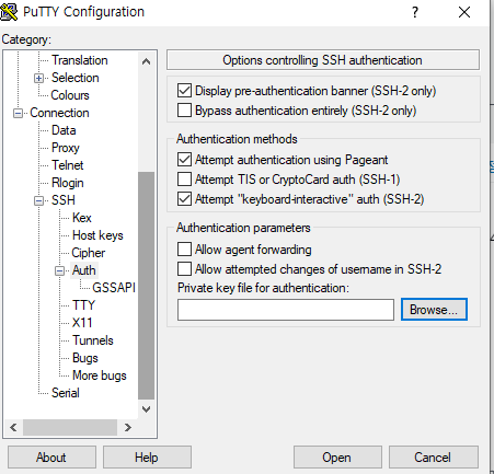 3. SSH - Auth 로 가서 Browse 클릭 후 저장한 키(ppk)를 불러옵니다.