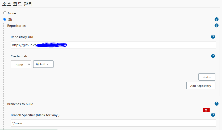 7. 소스 코드 관리에 Git을 선택하고 해당 저장소 URL을 등록합니다.