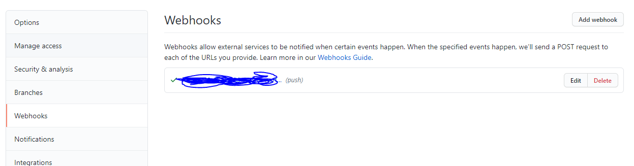2. Webhooks 를 들어가줍니다. 그러면 Webhooks 설정을 할 수 있는 페이지가 나옵니다.