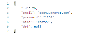 UserMapper에서는 keyProperty 가 "id" 이기 때문에 데이터를 저장하게 되면 id 값은 반환이 되지만 det는 null 인 것을 확인 할 수 있습니다. 데이터베이스에서 자동생성되고 우리는 사용자가 요청한 데이터를 반환하기 때문에 데이터 베이스에 저장된 det를 얻어 올 수 없었습니다.