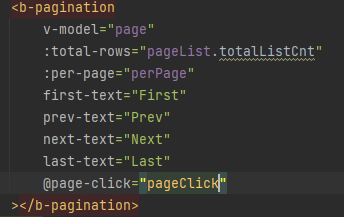 <b-pagination>에서 제공하는 @page-click 가 있습니다. 블록 버튼을 클릭하면 page가 해당하는 page로 바뀌게 됩니다.