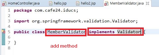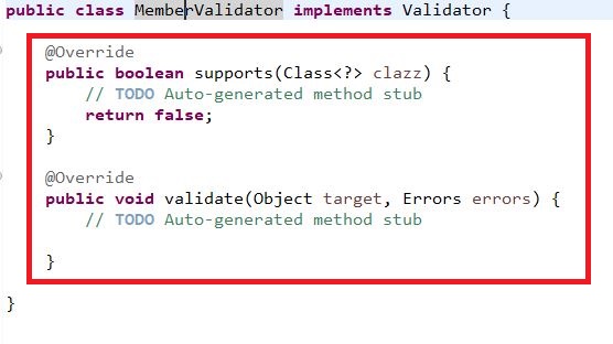 그러면 MemberValidator 의 빨간줄이 생기는데 add method를 해주면 이렇게 두개의 메소드가 자동으로 만들어진다.