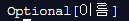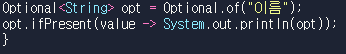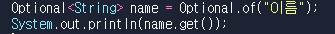 결과는 "이름" 이라고 출력이 됩니다. 이 "이름"은 Optional 형 객체입니다.