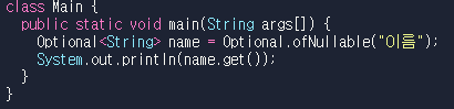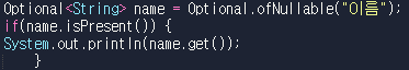 이 메소드를 통해서 name이라는 Optional 객체가 null인지 검사를 하여 get()으로 가져 올 수 있습니다.