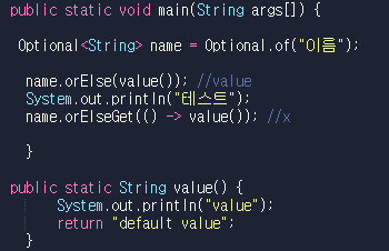 이처럼 orElse()는 value() 메소드를 호출한다. orElseGet()는 value() 메소드를 호출 하지 않는다. 값이 비어있는 경우에 orElseGet()은 메소드를 호출한다.