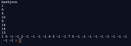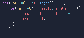 * &&result[j]==-1을 해주는 이유는 입력값이 baekjoon일 경우 o가 두번 나옵니다. 같은 알파벳인 경우에는 먼저 나온 알파벳의 순서로 결정됩니다. 그러니 처음에 -1로 초기화 시켰으니 모두 -1인 상태에서 순서대로 값이 들어가게 되면 -1이 아닌 값으로 변하게되며 o가 5번째로 들어가게 되는데 result의 알파벳 o의 위치값이 -1이 아닌 5가 들어가게 되므로 다음 o를 찾았을 경우 값이 바뀌지 않게 됩니다.