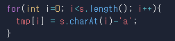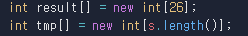 그리고 입력받은 문자열의 길이만큼 tmp 배열을 만듭니다. - 이 배열은 입력된 문자열 중에 첫 번째 부터 a~z중 어느것이 입력됬는지 비교하기 위함입니다.