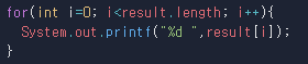 result배열을 출력해줍니다. 인덱스마다 " " (공백)을 넣어야하므로 printf로 공백을 만들어 출력해줍니다.