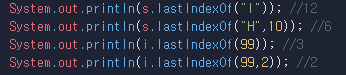System.out.println(s.lastIndexOf("l")); //12