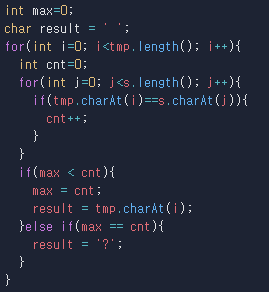 max 값과 cnt 값이 같은 경우는 많이 사용된 알파벳이 같다는 뜻이겠죠. 그래서 ? 를 출력해줍니다.
