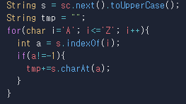 indexOf()를 통하여 문자열 s 에 사용된 'A'부터 'Z'까지의 어떤 문자가 사용되었는지 찾아냅니다.